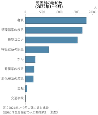 厚労省が約5カ月遅れで公表している22年1〜9月までの死因別死亡数を前年と比較すると、全体で約8万1千人増加した。このうちコロナの死亡数は約1万5千人、循環器系の疾患は約1万7千人、老衰は約1万8千人それぞれ増えた。年代別では循環器系の疾患や老衰で亡くなっている人の多くは80代以上だった。