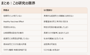 この論文は大規模で価値のある研究ですが、「短期死亡リスクはワクチンで上がらない」という結論をどう解釈するかについて、いくつか重要な限界があります。